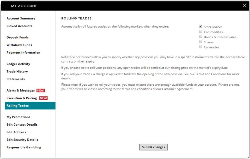 All ‘daily’ indices trades will automatically roll every weekday at their specified roll times. Any ‘daily futures’ indices trades will also automatically roll every weekday at their specified roll time up until the final trading day of the existing contract. You can specify whether you would like to roll any indices ‘futures’ or ‘daily futures’ trades to roll into the next contract by visiting the ‘Rolling Trades’ page within ‘My Account’ once you have logged in.