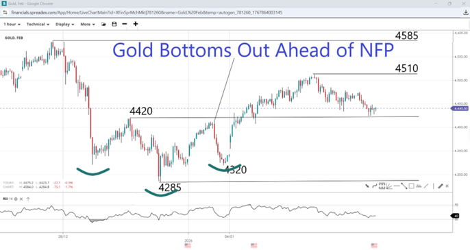 Ahead of the release of the jobs data, amid safe-haven demand driven by geopolitical tensions. As the situation in Venezuela stabilises, traders now have Greenland to worry about, amid rising diplomatic tensions between the US and the EU. After two weeks without Fed speakers, traders are looking for commentary to provide insight into the balance of hawks and doves and how concerned FOMC officials are about the jobs market. Attention is also returning to the appointment of a new Fed Chair, which US President Donald Trump had teased for early January before headlines were occupied by Venezuela. All of that could affect the timing of the next rate cut, with upside for the yellow metal contingent on traders becoming more convinced that the Fed will ease in March.
