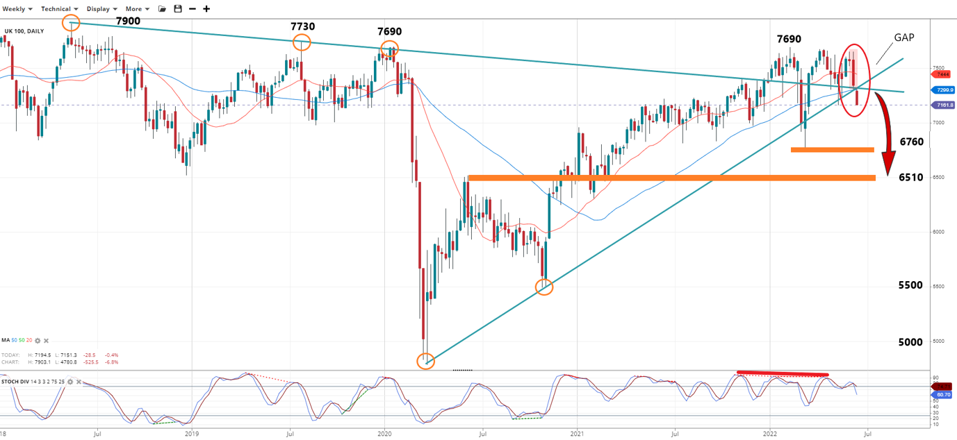 The UK 100 index has had a few weeks of sideways price action that has turned more bearish as of last week. As if the bearish engulfing weekly bar wasn’t enough, this week opened with a gap lower. Now, 6760 and 6510 are near-term supports.