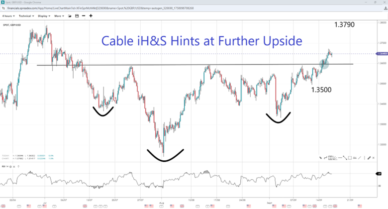 The GBPUSD has been gaining through the early part of the month as the market gets more sure about easing from the Fed. The pair touched highs not seen since July amid pre-FOMC dollar weakness, breaking above a long-standing resistance level near 1.3600, which might be the neckline of a potential inverse head-and-shoulders pattern. The prior swing low at 1.3500 provides support in the short term, with the pattern invalidated as low as 1.3350 (shoulder). The RSI has pulled back from overbought, which might mean the pair still has momentum for another upward push without a divergence formation, opening the door to the recent high of 1.3790. Intermediate resistance sits at the psychologically important 1.3700 handle.