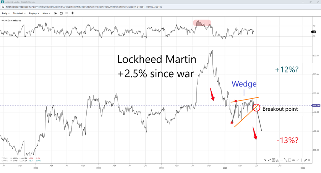 Despite rising 2.5% since the conflict erupted, Lockheed Martin has formed a wedge pattern in a bearish market, pending a potential breakout near the $460 area. Using the measured-move projection from $420 to $480, a bearish move would initially open the door to the $400 level, where support might form. However, if $450 or any higher support level holds firm, the wedge could be of the rising type, initially suggesting a breakout past $490 and towards the $550 handle. This would bring into focus the all-time high of $615, at which point the stocks lost momentum and initiated the bearish leg.