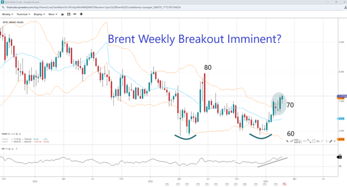 Brent crude appears to have left behind a double-bottom support near $58, with the current VWAP expansion on the weekly chart suggesting an imminent breakout. If bulls can sustain prices above the $70 psychological support, Brent could extend its gains to the $80 handle with RSI showing more room for upside. However, a pullback or a full-blown reversal remains in play as well. Losing the round support and the median VWAP near $64 would open the door to $60 once again, re-exposing the lower VWAP.