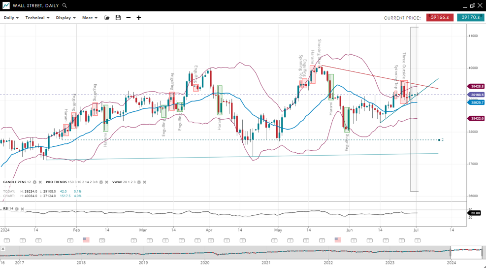 Wall Street | Bullish | Consolidation | 39168 | 38925 | 38422 | 39428 | 55 |