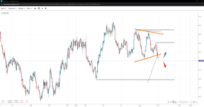 Falling under the triple support of $22.35 could validate a triangle pattern in silver with a truncated final wave, paving the way to a projection low of $19.50 if it gets through $20. Holding firm may encourage some respite towards the $24 barrier but is unlikely to move closer to $25.50.