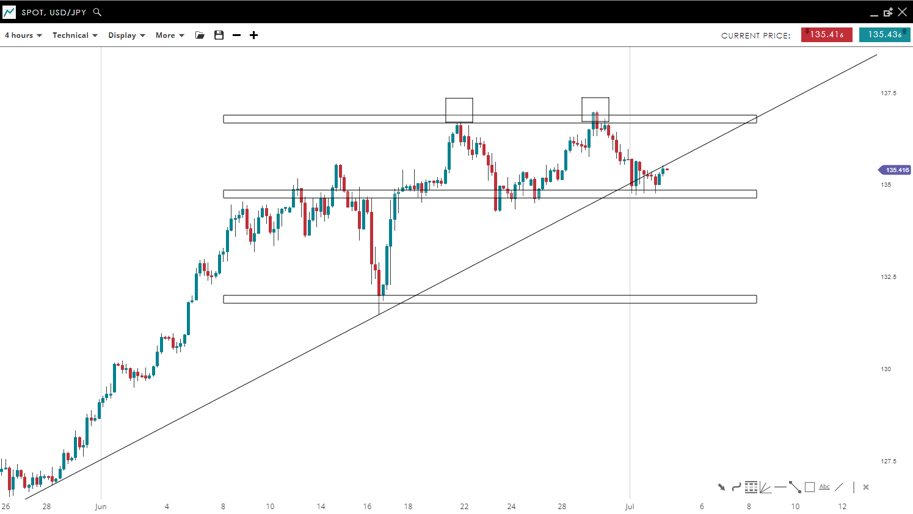 The price of “USD/JPY” has entered into a sideways range after an aggressive move to the upside. The asset posted a double top formation near a strong resistance level which led to a reversal and move to the downside. The Dollar-Yen successfully broke the bullish trend line to the downside which indicates that the sellers are in control of the market. A break and close below the pivot level (134),  could see the “USD/JPY” reach  131, the June 16 low.