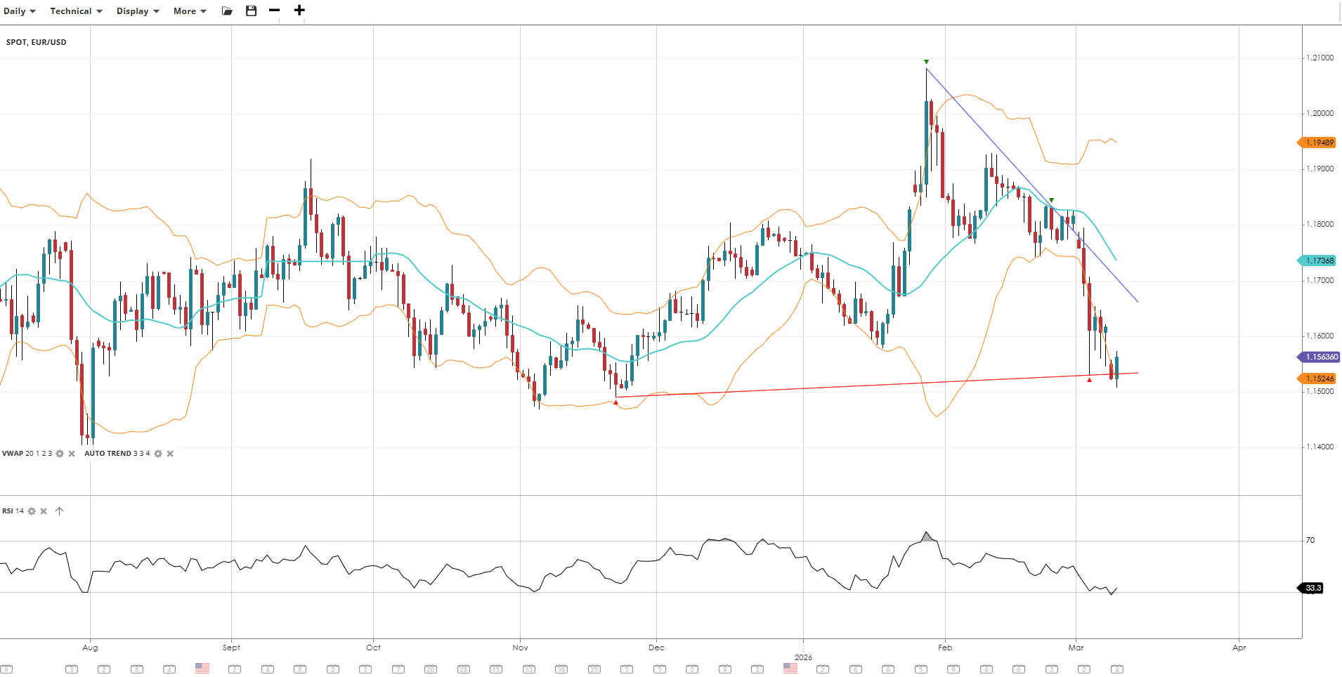 EUR/USD has shifted into a bearish impulsive phase following a sharp rejection from its February highs, with price now trading aggressively below the VWAP. Momentum is deeply negative with RSI near oversold levels, as the pair cuts through successive support zones in an accelerating downtrend.