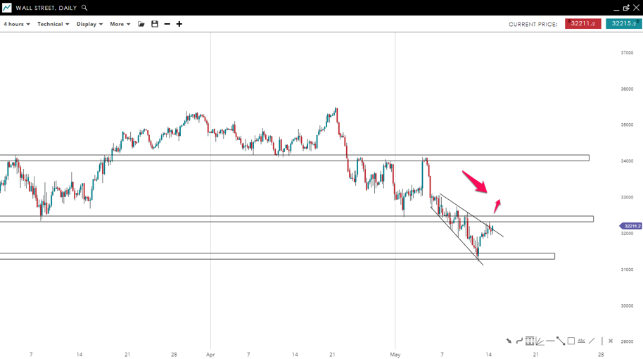 Wall Street is in a clear downward movement, however the price is trying to break out from a wedge formation to the upside. If a breakout occurs, it might test the 32,400 mark. For now, the market is still bearish unless the index can successfully close above the mentioned resistance, then the odds would increase for the trend to revere, sending the price moving  higher toward the 34,100 level.