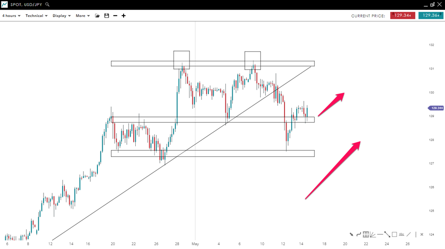 The price failed to break the strong resistance level around the 2-decade high at 131.2, where a double top pattern has been left. This led to a reversal and a move lower after breaking the bullish trend line. The pair found buyers around 127.4 then again at 128.80, which could setup the price to move all the way up to the double top high.
