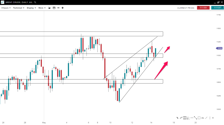 Brent Crude oil is trading inside a rising wedge pattern where the market retraced briefly to the strong support level around 110. If the buyers continue to overwhelm the sellers, this could lead to a move higher to test the previous high around the 114 level. A breakdown from the wedge, however, could see the market test support near 105.