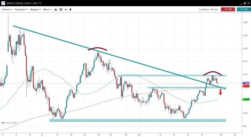 The price has broken over and is now consolidating above a downtrend line starting at the March 8 peak (ignoring the spike on March 6). If the breakout fails with a move back under 110, it could trigger another test of the psychological 100 level. Otherwise a break above the recent peak would indicate the uptrend