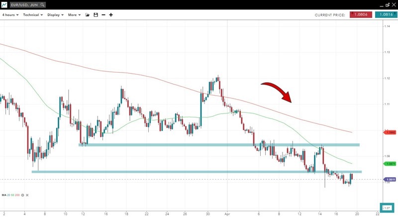 The big 1.30 continues to hold as major support. Some long-wicked candles off 1.30, despite a breakdown from support just above at 1.305 show some potential for a bottom but the trend remains down while under the downtrend line starting at the late Feb highs.