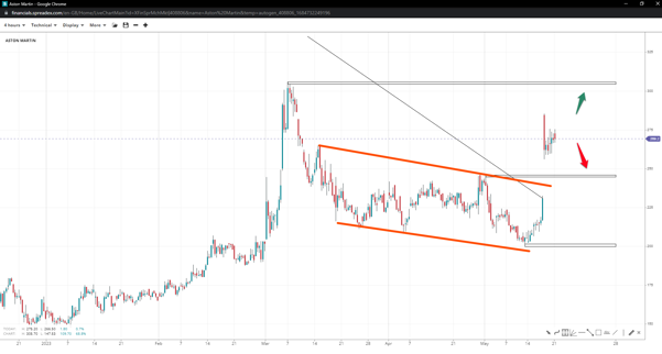 Aston Martin’s stock price has gapped higher after completing a flag down at 190 GBX, eying the 300 GBX hurdle next. Breaking past the said resistance might enact an extension toward the gap of 400 GBX, with the measured move targeting 335 GBX in the shorter term. Conversely, failing to stay above 245 GBX might reverse the trend and bring the stock back to 200 GBX.