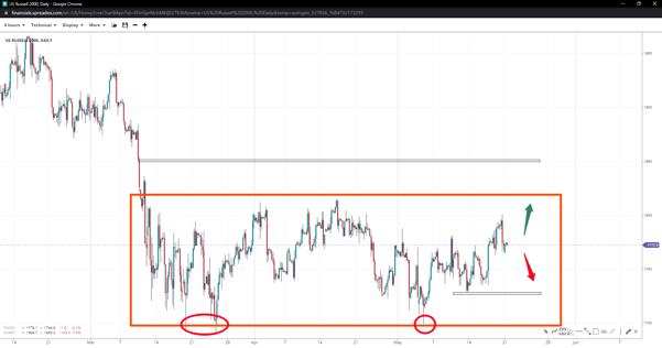 Small-cap Russell 2000 caught a double-bottom bounce to the 1800 handle, with bulls eying a breakout toward 1855, should the range peak of 1815 gives way. A slide under 1730 might provoke further bearish bets back to the lower end of the range unless we see a consolidation prevailing.