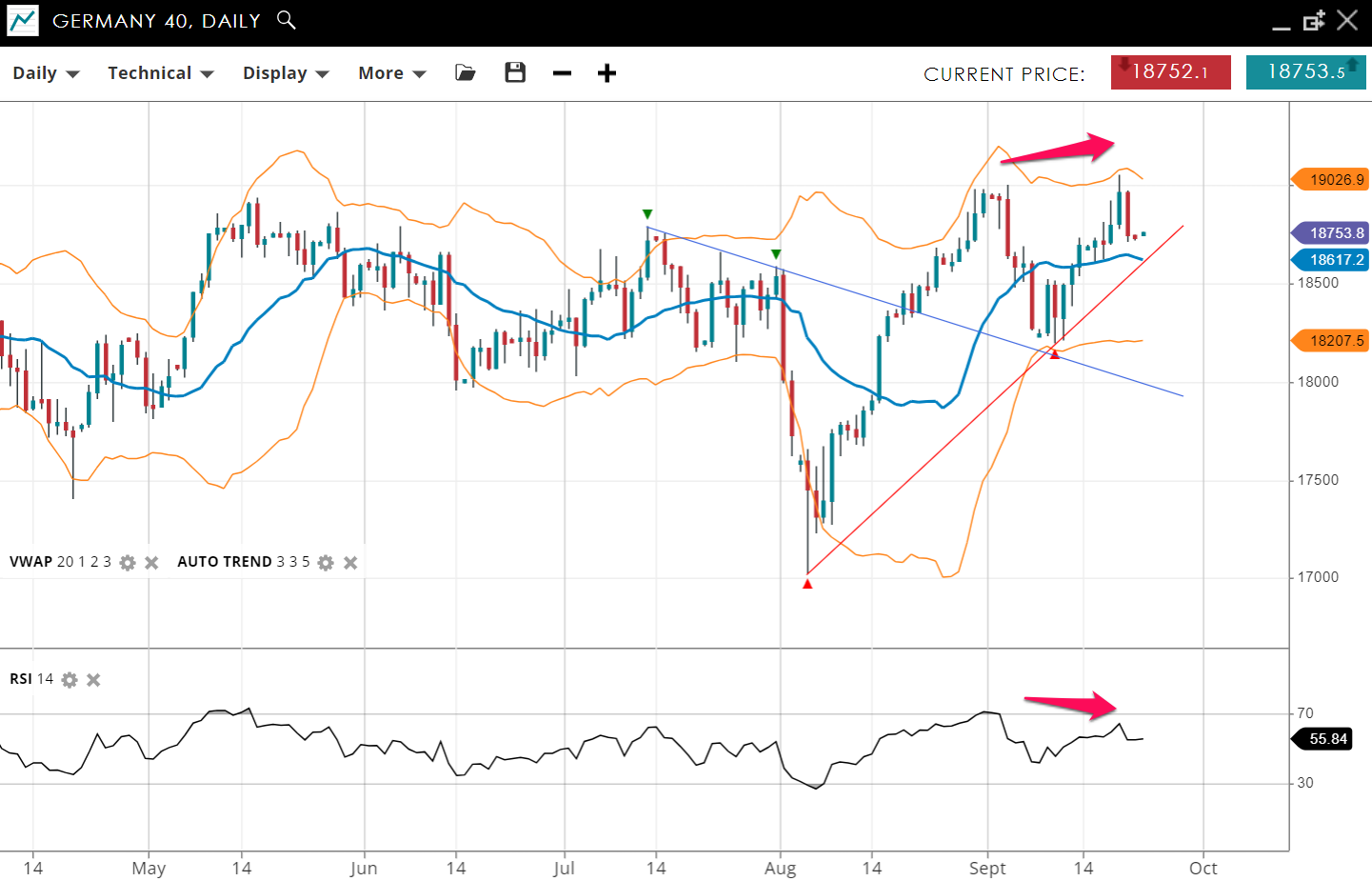NOTE: These charts use the ‘Pro Trading Tools’ available on the SpreadEx trading platform. To use them, log in to your and click ‘Technical’ from the menu on any chart.