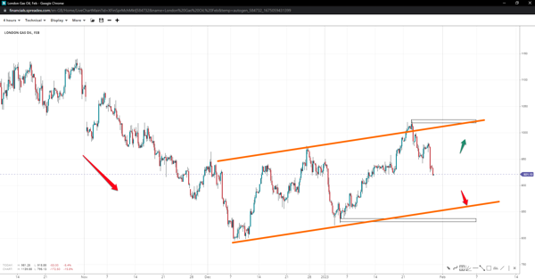 The price of London Gas reached a high of 1025 before reversing bearishly, leaving a flag pattern imprint and aiming for the lower channel below 900. Losing the bottom trendline could see a leg down at the 800 base unless  830 offers some respite. An upward attempt could see triple digits revisited.