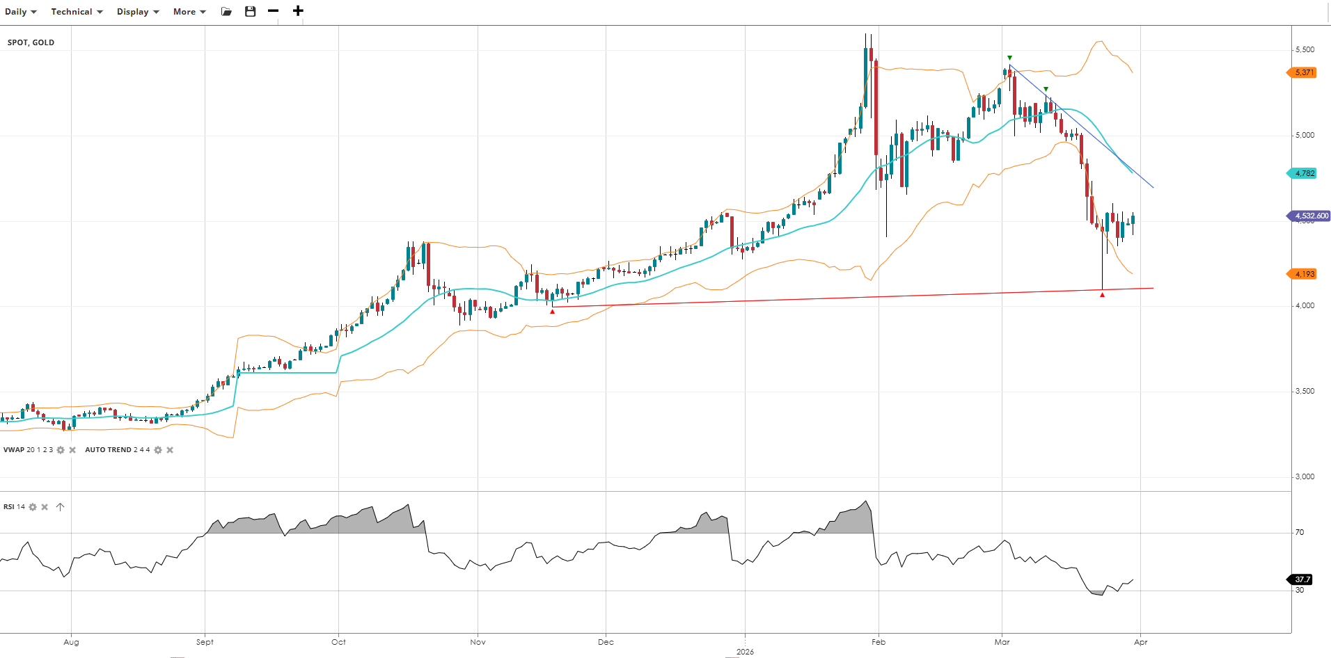 GBP/USD has been trading in a 200-pip range for most of March, now trading below a flat VWAP. The RSI has softened to 40 after touching 50, reflecting the modest but steady bearish pressure. The long-term range remains intact, and the pair will need to take out the high or lows of the range to start a new trend.