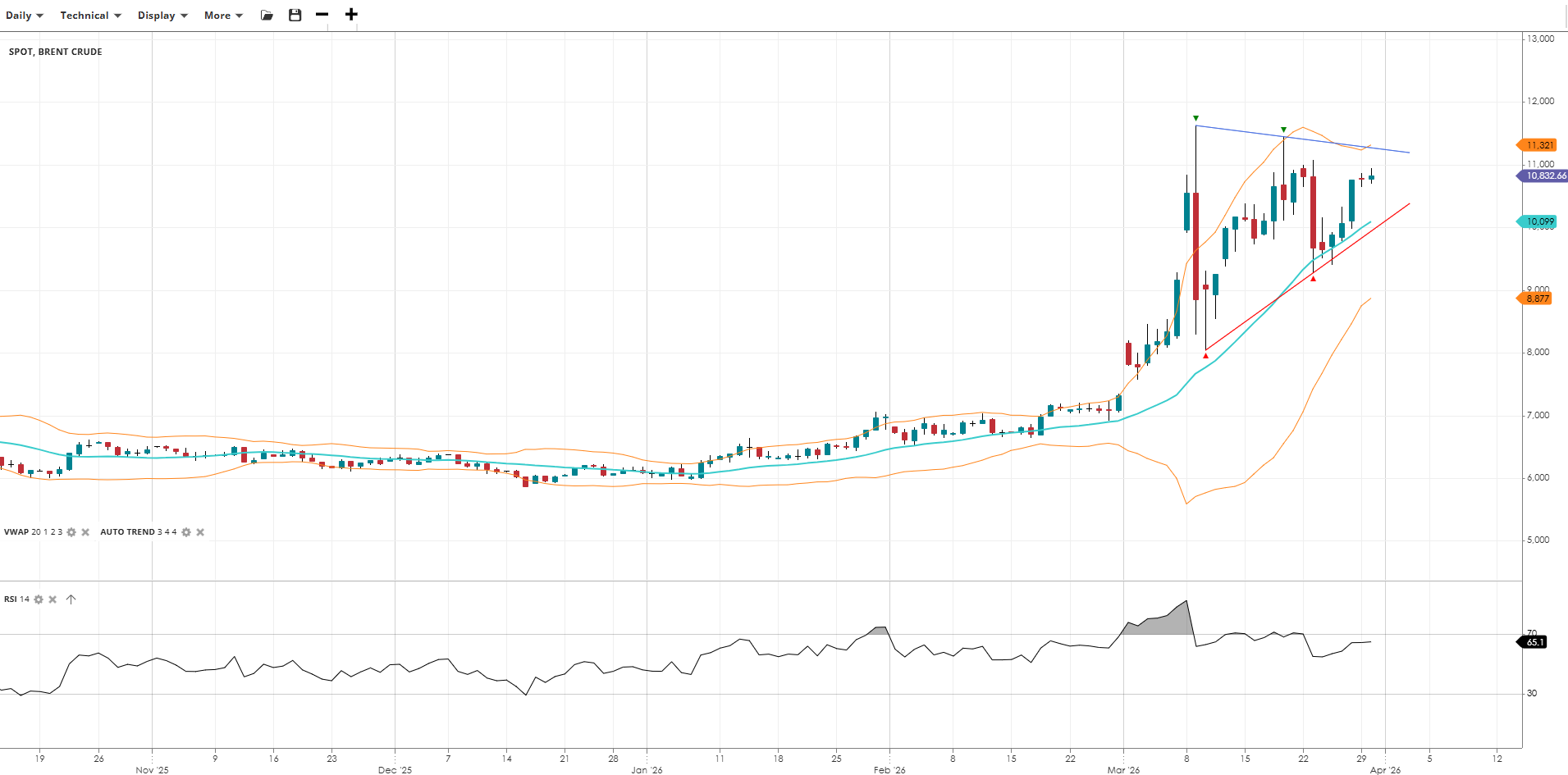 Brent Crude is sitting inside a volatile triangle pattern as it continues to trade above the VWAP, maintaining the broader bullish structure. The RSI has eased from overbought levels into more neutral territory, consistent with a healthy consolidation after the explosive move higher. The uptrend means a breakout is higher probability but a breakdown through the triangle support and VWAO could signal a double top.