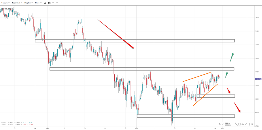 UK 100 is back above the 7000 handle and marginally below the swing high of 7100. Price action resembles a rising wedge with all higher highs complete, suggesting either a pullback before an advance or a breakout higher. Recapturing 7100 exposes 7330, whereas failing the 6920 support might clear the path towards 6790.