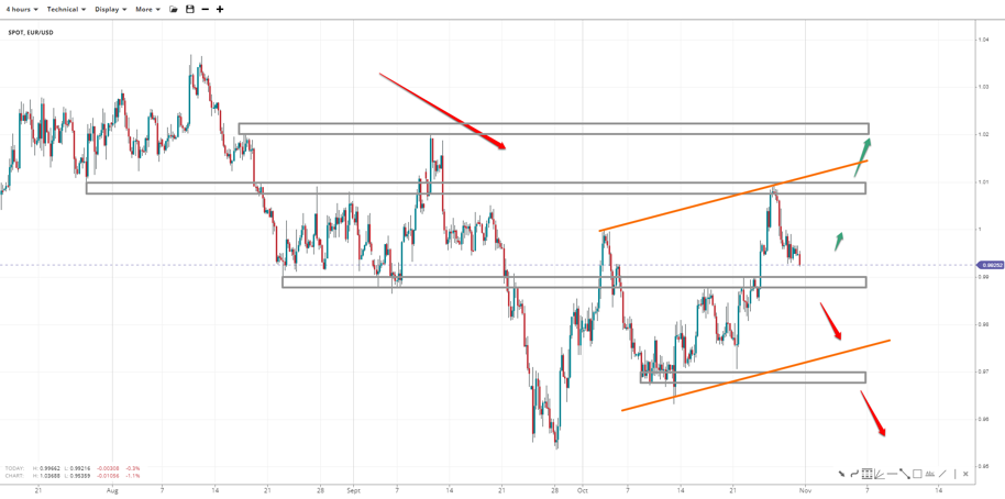 EUR/USD slides towards 0.9900, and if the low softens, the chances of a falling flag will rise. The lower trendline lies below 0.9800, with support below there at 0.9700. If the round-level holds, however, and bears cave in at 1.0000, 1.0100 and 1.0200 will return on bulls’ watchlist as the pattern will resemble a rising wedge instead.