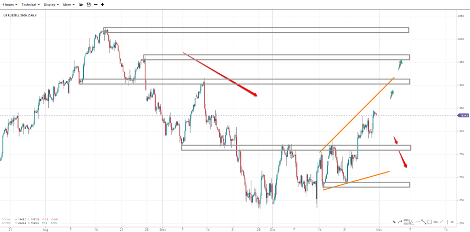 Russel 2000 appears spiralling upwards in a broadening wedge following a break above 1770. If the trend progresses, 1900 is apparent resistance, with 1970 and an attempt above the 2000 handle coming up next. The door towards 1700 and below might open up if the former support is lost.
