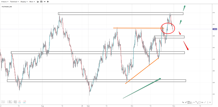 Platinum found resistance at 975.00, forming a double top. However, the attempt came after an ascending triangle breakout, increasing the chances of a breakout if the 925.00 support offers rejection. Piercing the top might bring 1150.00 in focus, being the measured move, with quadruple digits a near-term resistance. Otherwise, the metal might reverse down to 800.00, with 890.00 and 830.00 as temporary supports.