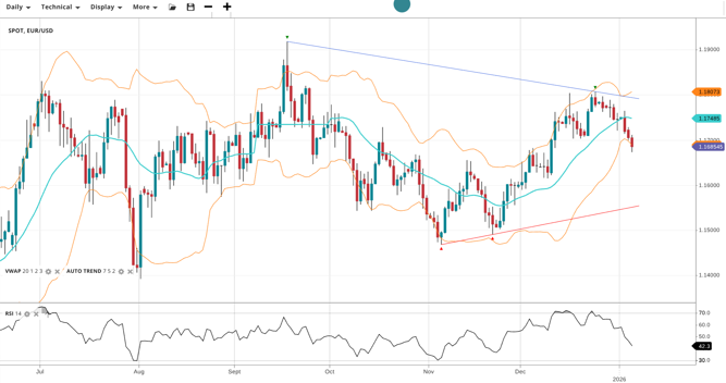 EUR/USD is neutral and trading within a range. Currently priced at 1.1685 and below the VWAP of 1.1745, it faces immediate support at 1.1680 and resistance at 1.1807. RSI at 42.3 indicates weakening momentum.