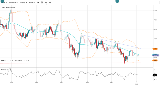 Brent Crude is in a bearish correction, with price at 6,060, slightly below the VWAP of 6,100. The RSI at 44.5 indicates weakening pressure. Support is found at 5,925, while resistance remains at 6,236.