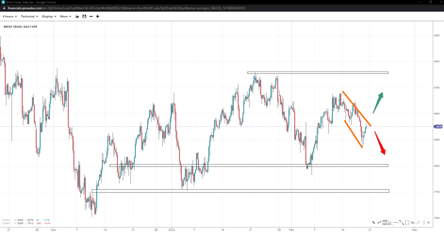 After hitting a low of 81.80, Brent oil might have completed a flag pattern, suggesting increasing demand towards 87.00 and 89.00. If bearish bets rise, the base break at the 80.00 handle might offer a retest bounce unless bears aim at 77.50 instead.