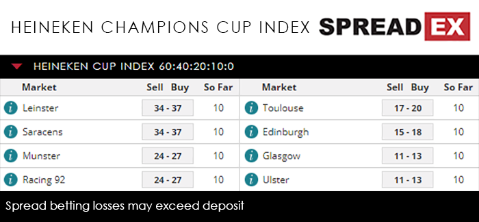 The defending champions are also favourites for the competition as a whole; while they share an Outright Index spread of 34-37 with Saracens, the Irish club sit at a superior fixed odds price of 7/4 to their English rival’s 9/4. If Leinster are victorious, it could well set up a replay of last year’s final in this season’s semis, as 2017/18 runners-up Racing 92 face Toulouse at 3.15pm on BT Sport 3 this Sunday. Interestingly, though Racing are well off the pace in the Top 14, trailing their weekend opponents by 16 points, they are still fancied to progress, if only just, with Spreadex offering a Racing 92/Toulouse Points Supremacy spread of 3-6. On the other side of the draw, Saturday sees Saracens resume their campaign with a visit from the Glasgow Warriors, at 3.15pm on BT Sport 3. The best-ranked team following the group stages, Saracens will fancy their chances, even if the Warriors are top of the Pro14’s Conference A, with Spreadex offering a Saracens/Glasgow Points Supremacy spread of 14-17. Finally the quarter-finals actually begin at 12.45pm on Channel 4, as Edinburgh take on Munster. The Scots aren’t have the best season over in the Pro 14, while the Irish side are only a few points behind Glasgow, a situation that contributes to the Munster/Edinburgh (h) Points Supremacy spread of 3-6.