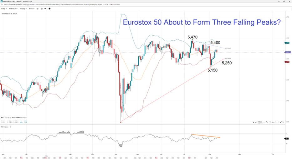 The Euro Stoxx 50 premier index of European firms dropped after the tariffs were announced at the start of the month. Its recovery faces a crucial test as RSI pops above 50, and it closed almost in the middle of the Bollinger Bands. If the index continues to recover, it could face resistance at the pre-tariff level of 5,400, which has now turned into resistance. A break higher could find resistance at the 5,470 level. On the flip side, if the index turns downward, it could form a third falling peak, suggesting a potential downward continuation. Support could be found at the LBB, which coincides with the June low at 5,250, followed by the nearest swing low at 5,150.