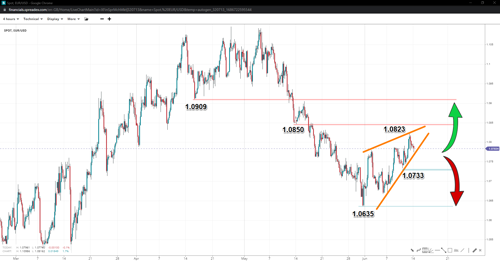 Traders will likely be keenly focused on President Lagarde's post-rate decision press conference for clues about what will happen in the next meeting. Particular attention will likely be on whether she repeats the "too high for too long" phrase or turns to the "gone most of the way" popular phrase amongst doves. The Euro has been gaining in recent days as it appears the Fed is diverging from the ECB, with its talk of a skip compared to the shared central bank seen pressing on with hikes. What the Fed signals for July compared to what the ECB does could shake up the currency pair substantially over the next few days.