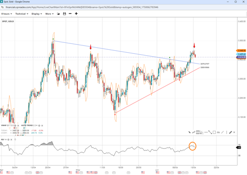 Gold spot prices have formed a double top near $3450 per ounce, with short-term price action and an RSI rejection suggesting a potential break below the lower 20-period VWAP level near $3415 at the time of writing. The ‘autotrend’ tool reveals that the next support levels sit at $3378 and $3359, bringing the focus to the apex area of a potentially complete triangle pattern. A breakdown could see prices decline towards $3300, while a bounce could see the resistance turn to support, boosting prices past the VWAP high at $3448 and eventually exposing the market peak at $3500.