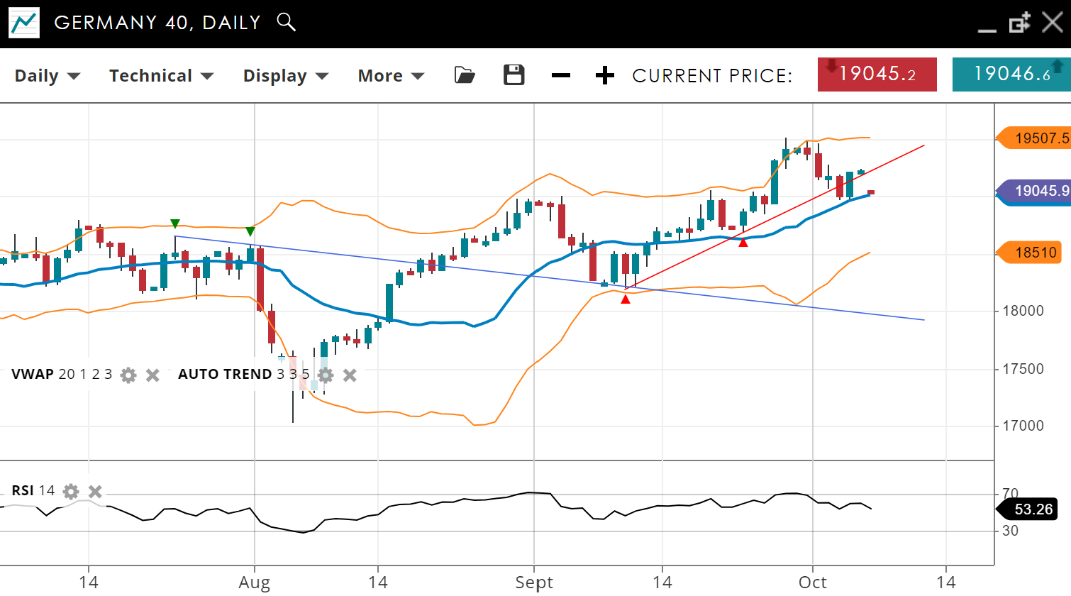 Germany 40 remains bullish but has shifted into a corrective phase. The price is 19,045, just above the VWAP (20) of 19,000. Support is at 18,510, with resistance positioned at 19,507. The RSI of 53 reflects neutral momentum, signalling the potential for further consolidation.