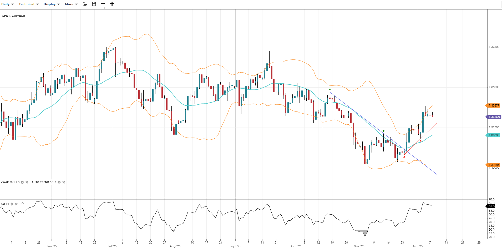 GBP/USD continues its near term rebound but the bigger picture is one of a down-sloping price range. It trades at 1.3317, well above the VWAP of 1.3203. The RSI of 61.3 supports the upward momentum. Support sits at 1.3018, and resistance is at 1.3388.
