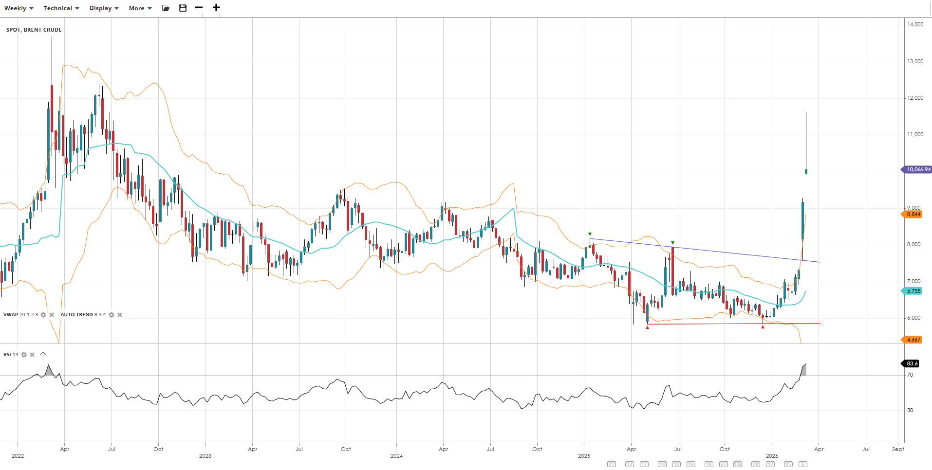 Brent Crude has surged in a powerful impulsive bullish breakout, trading well above its VWAP with RSI in extreme overbought territory. The weekly chart confirms the move is a significant structural breakout, though the degree of extension from the mean suggests elevated risk of a sharp mean-reversion pullback in the near term.