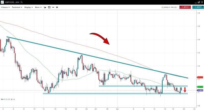 The big 1.30 continues to hold as major support. Some long-wicked candles off 1.30, despite a breakdown from support just above at 1.305 show some potential for a bottom but the trend remains down while under the downtrend line starting at the late Feb highs.