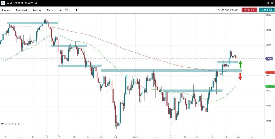 The price of Wall Street broke above the ceiling of its range, which is the new pivot for near term direction. The trend is now up, while the price holds above its moving averages.