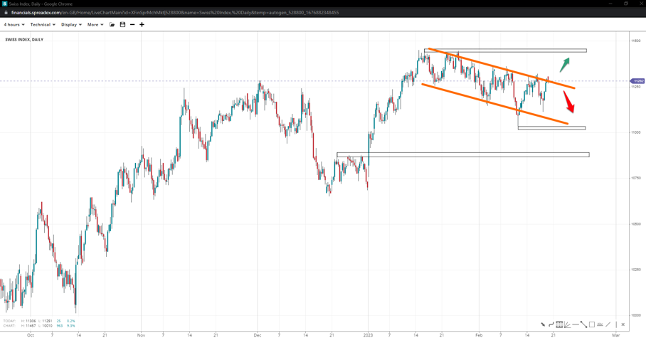 The Swiss index continued to descend into its flag pattern unless the low at 11035 completed it. If the index crawls towards the top of 11460, the pattern might already be complete. Further drawbacks could bring the index below the 11k handle, opening the door to 10790.
