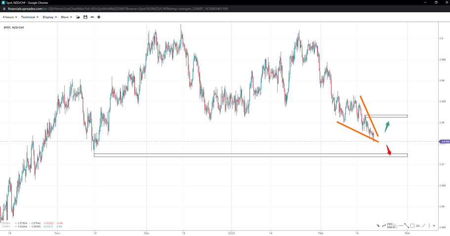 NZD/CHF has formed a wedge pattern down at 0.5750, but the swing has not offered much bullish momentum so far. Sliding lower could invalidate the pattern and reach a low of 0.5725, whereas a reversal might clear the path to 0.5836 if bulls manage to reclaim 0.5818.