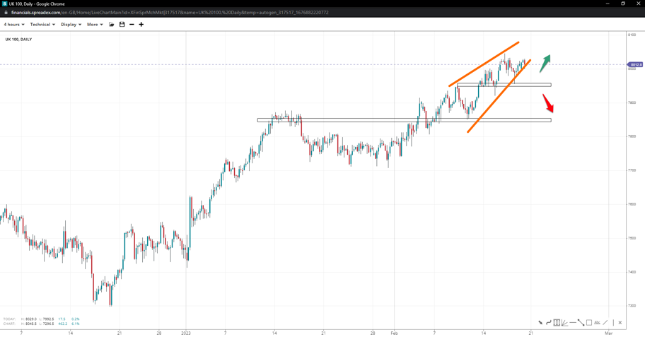 The UK’s 100 index might have completed or is due to complete a wedge pattern. After a surge to 8045 and a drop to 7955, only to recoil to the 8k handle signals an imminent breakout. If 7950 fails to hold, the index could slide to 7850. Otherwise, price discovery could see us up to 8100 next.
