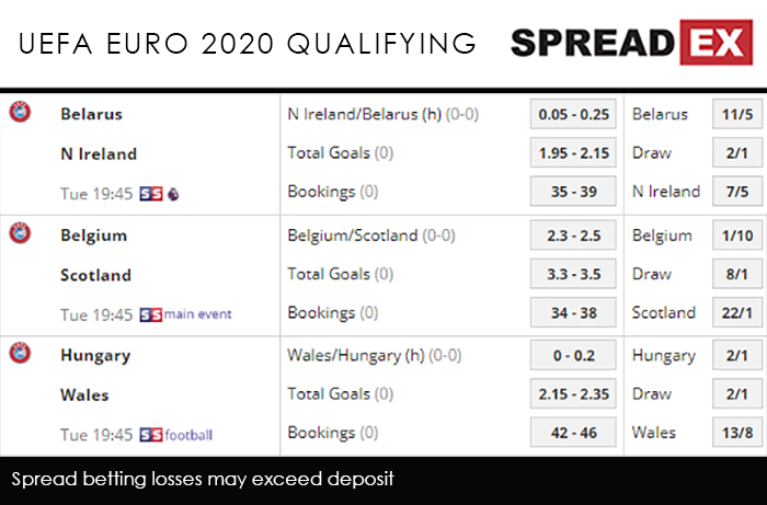 In comparison, Belgium are yet to lose a game. A 3-1 opening win over Russia saw them see off their main group rivals, following that up with routine wins over Cyprus and Kazakhstan. With Romelu Lukaku at a Super Mega PGM at 63-73 and Eden Hazard at 48-56, the hosts should continue that run. Spreadex are offering a Belgium/Scotland Goal Supremacy spread of 2.25-2.45, alongside a Total Goals spread of 3.25-3.45. In a cagey Group E, Wales will be looking to dent Hungary’s hopes at 7.45pm on Sky Sports Football. A narrow victory over Slovakia had gotten the Welsh campaign off to a decent start. However Saturday saw them slip to a 2-1 loss against last year’s beaten World Cup finalists Croatia, a 77th minute lifeline from David Brooks failing to lead to an equaliser. Brooks could start in Budapest, and sits at a Super Mega PGM of 12-16, well off Gareth Bale’s 33-39. As for Hungary, they’ve won 2 of their 3 fixtures, an opening loss against Slovakia following by an important victory over Croatia and a solid 3-1 win in Azerbaijan. It makes Tuesday’s game hard to call, with the visitors just about having the edge at a Wales/Hungary (h) Goal Supremacy spread of 0-0.2, alongside a Total Goals spread of 2.15-2.35. Finally, Northern Ireland will be aiming to continue their Group C-topping run when they travel to Belarus, at 7.45pm on Sky Sports Premier League. Dealt an unforgiving draw – they have been paired with Germany and the Netherlands – so far Michael O’Neill’s men have done exactly what they need to do, beating the group’s ostensibly ‘lesser’ sides. A 2-0 victory over Estonia was followed by a late winner against Belarus, and a 2-1 comeback in Talinn. The Belarussians, meanwhile, are winless after 3 games, that aforementioned loss in Belfast joined by a 4-0 hammering in Rotterdam and a 2-0 defeat at home to Germany. They are likely to be on the losing end tonight as well, with Spreadex offering a Northern Ireland/Belarus Goal Supremacy spread of 0.05-0.25.