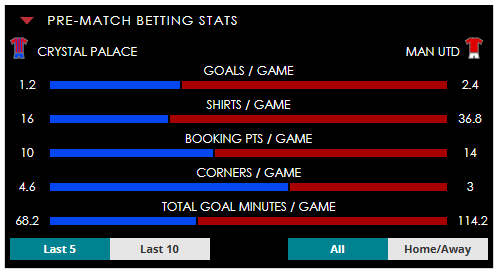 To see all the Crystal Palace v Man Utd betting stats and form, visit our pricing page to view our Pre-Match betting stats table or hover over/tap the chart image to see previous outcomes for that particular market.