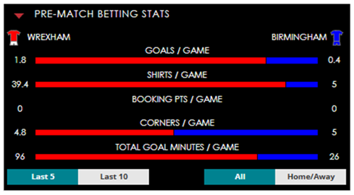 To see all the Wrexham v Birmingham betting stats and form, visit our pricing page to view our Pre-Match betting stats table or hover over/tap the chart image to see previous outcomes for that particular market.